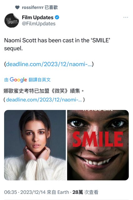 推 nanalove45 : 以為她要往音樂發展了,沒想到還會回來演電影12/15 12:42