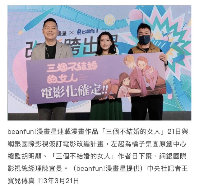 漫畫星同步於會中宣布,「三個不結婚的女人」與網銀國際影視正式簽訂電影計畫。