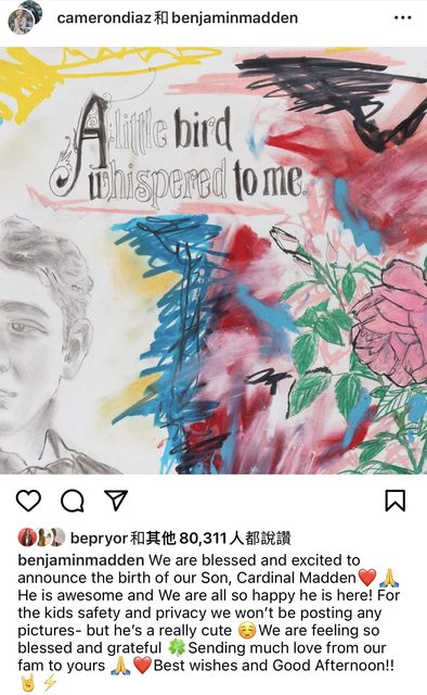 兩人在社群平台Instagram發文表示:「我們很高興也很興奮地宣布我們的兒子卡蒂納