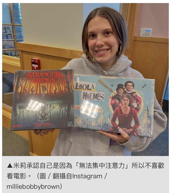 2004年出生的她除了演員身分外也身兼多部電影製片人,不過她卻在近日自爆「不喜歡 看電影」,掀起話題。 據英國媒體《太陽報》於當地時間23日的報導指出,米莉芭比布朗表示:「我因為無法 集中注意力而不看電影。」米莉補充:「我不看電影的。每次有人跟我說,哪部電影很 值得一看,這部電影會改變你的生活之類的話,我都會想著,那我需要坐在那裡多久呢?因 為我無法集中注意力,所以我不喜歡看電影。」 https://i.imgur.com/obEmRG0.jpg