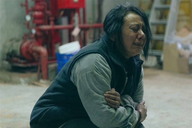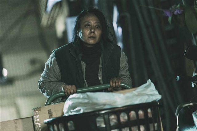 一場戲,她推著回收車經過大廈前,意外遇上跳樓雙屍慘案,但她卻異常冷靜無視。她解