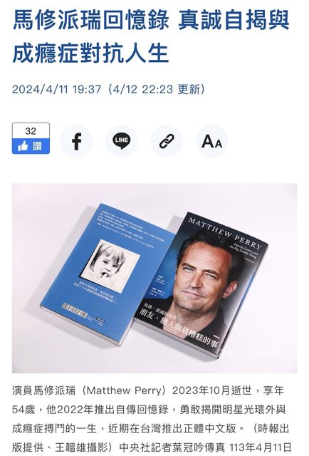 標題[新聞] 馬修派瑞回憶錄 真誠自揭與成癮症對抗人
