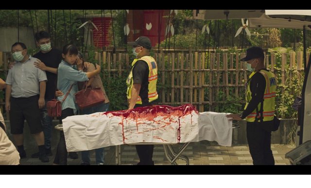 然後救護人員擔架上有一個滿身是血