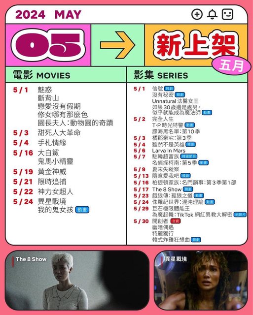 5/1 魅惑 斷背山 戀愛沒有假期 修女哪有那麼色 園長夫人:動物園的奇蹟 5/3 甜死人大革命 5/4 手札情緣 5 /16 大白鯊 鬼馬小精靈 5/19 黃金神威 5/21 限時追捕 5/22 神力女超人 5/24 異星戰境 我的鬼女孩(動畫) 母親節就和媽咪一起宅在家追劇 資料來源:網飛 -- ※ 發信站: 批踢踢實業坊(pttsite.org.tw), 來自: 49.218.91.13 (臺灣) ※ 文章網址: https://pttsite.org.tw/movie/M.1715163460.A.7F7