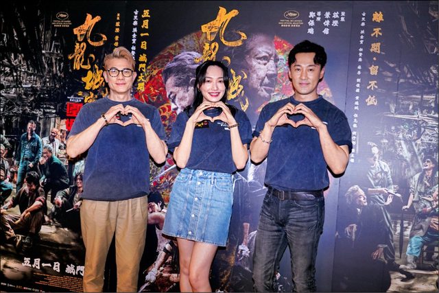 郭富城(左起)、蔡思韵及林峯在《九龍城寨之圍城》家破人亡,戲外終於合體宣傳。(
