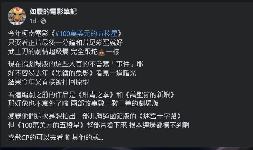 → naniyo : 票房刷新,比較沒早期那種幫路人辦案的故事 06/30 14:42