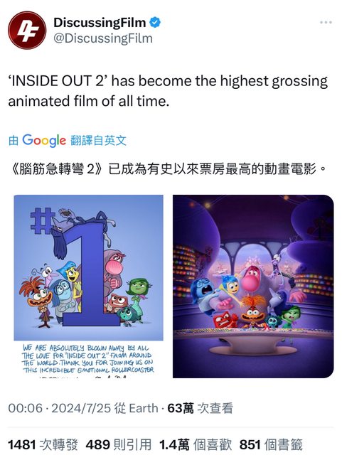 → DemonElf : 腦筋急轉彎2這樣的結果才是真的口碑實力07/25 13:20