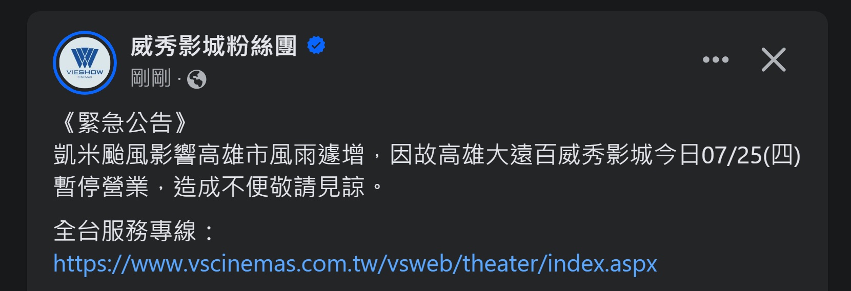 《百老匯影城》 正常營業 視風雨狀況調整