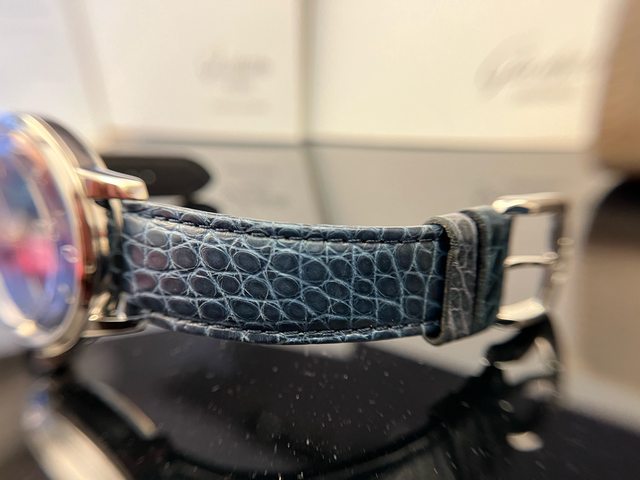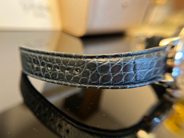 藍色路易斯安那鱷魚皮錶帶,顏色搭配錶盤,表耳寬度20mm,原廠只有針扣可選,欣賞機