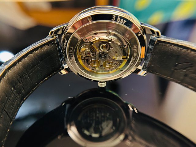 機芯透過拱形透明錶殼完全可見,錶殼背面的藍寶石玻璃幾乎達到了錶殼的邊緣,由於機