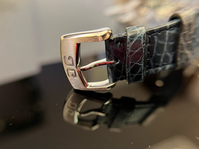裝飾,自動盤鏤空帶雙G標誌,擺錘外緣由21K金製成,用以增進上鏈效率。