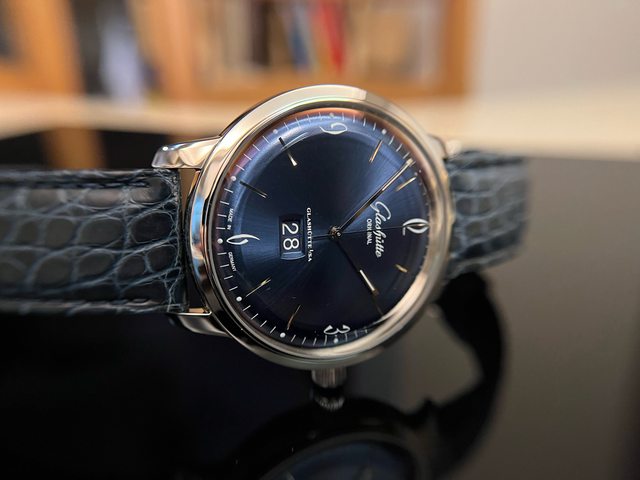 Glashutte Original最大特色之一,標誌性大日曆,顯示窗搭配面盤藍色為底+白色數字