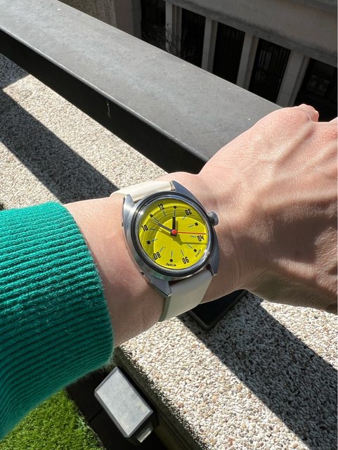 Modul A的鮮黃色(黃銅上漆)面盤由著名的錶盤製造商Cardor在德國製作,Modul系列用色