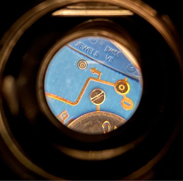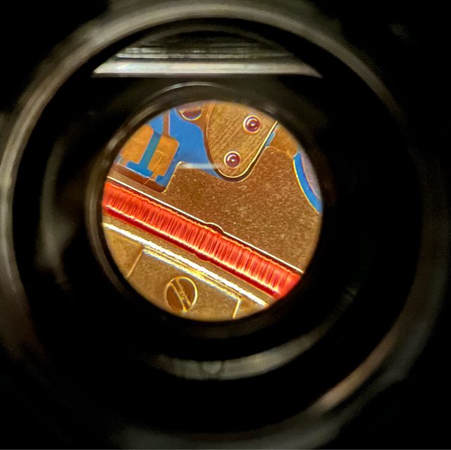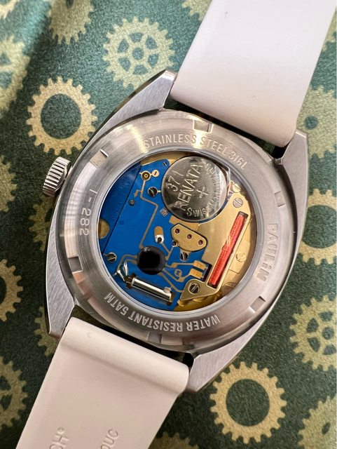 這支腕錶最吸引我之處在於其搭載的ETA 955.112石英機芯,擁有金色飾面和藍色電路板
