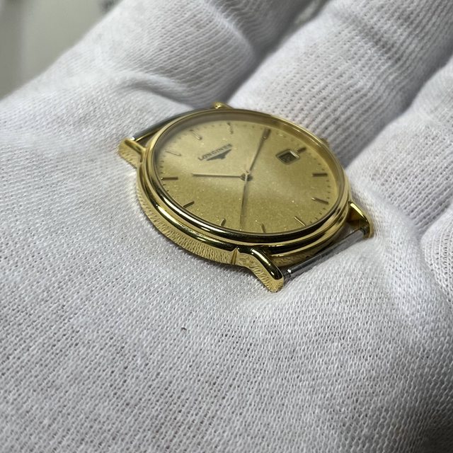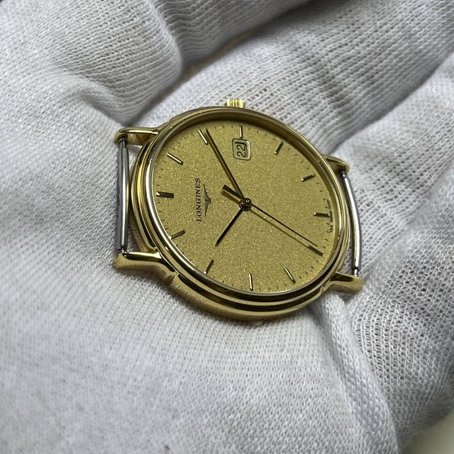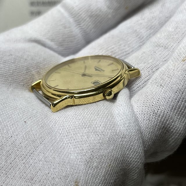 2.浪琴砂礫金面大三針石英錶 4900$ 錶徑含龍頭35,鍍金,無嚴重掉金 無附錶帶,原廠錶扣狀況佳,日期可快調 手錶有使用痕跡等,品相如圖
