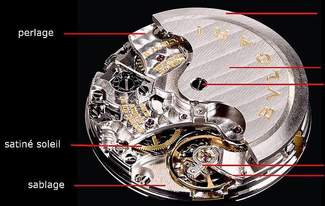 複雜的多層次結構也展現了做工上的細緻,與當前新款寶格麗極簡風的走向風格迥異,雖然盤面看似複雜,但卻巧妙保留了信息的易讀性。錶盤上半部採黑色縱紋,下半部採緞面太陽花輻射紋磨砂鍍銀裝飾,上下看似不一致,但搭配起來卻有一股不可言喻的美感&特殊性。
