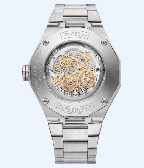 錶盤龍之意象以27個銅件錯落鑲嵌在25個不同的水平面上,日內瓦印記自動上鍊機芯,動