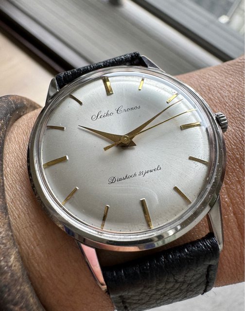 2.老精工Seiko cronos,約1960年代生產,手上鍊機芯,簡單大三針漂亮面盤,以70年左 右的老錶,外觀品項很不錯,已洗油保養,走時正常,售4600含運~