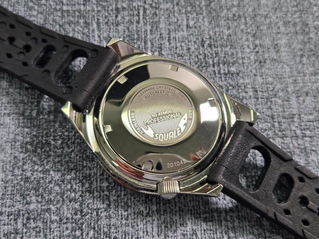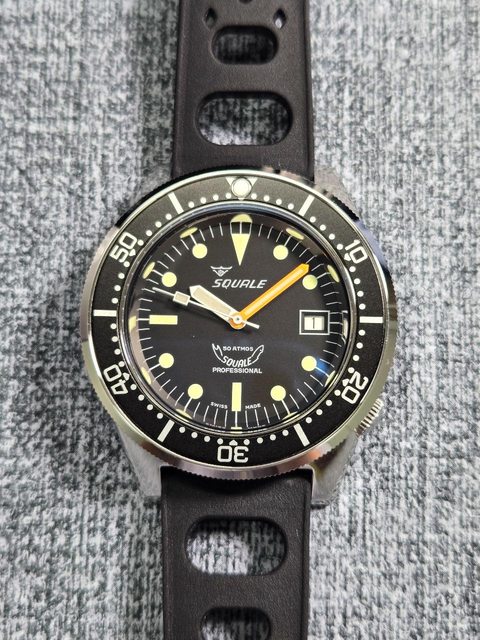 4. Squale 1521 50 atmos 曾為寶珀五十蟳的經典錶殼,500米防水厚度僅12.5mm,eta2824機芯,2024/02 gnomon購 入,近全新,含原廠橡膠錶帶、鋼錶帶、攜行袋。鋼帶全新未拆。售20000含運