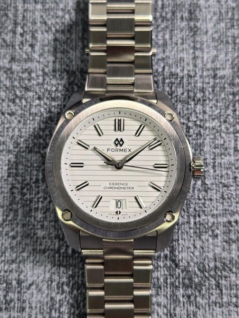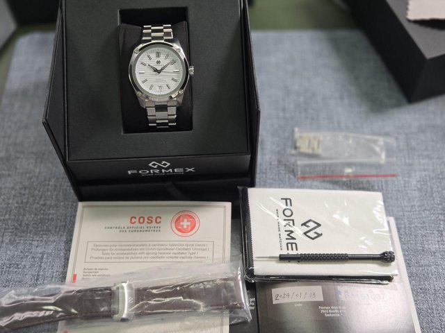 5. Formex essence 39 白面 小Aqua terra,錶殼懸浮系統,鋼帶做工優異,比真的AT還舒適。白面的時標指針經特殊 打磨,光影下自然呈現黑色。含原廠皮錶帶及可調整摺疊扣,COSC證書。2024/01保卡, 永豐豪代理貨,近全新,售35000含運
