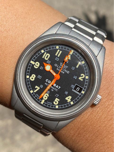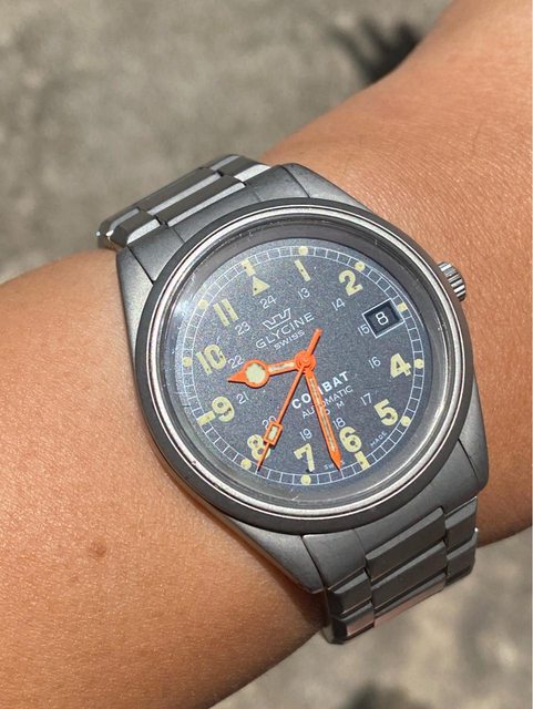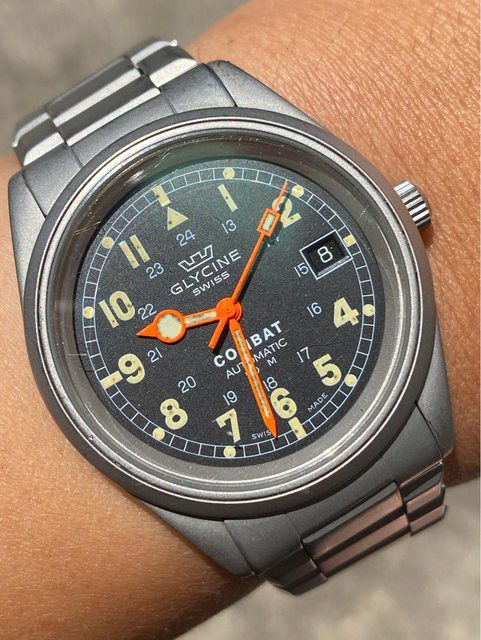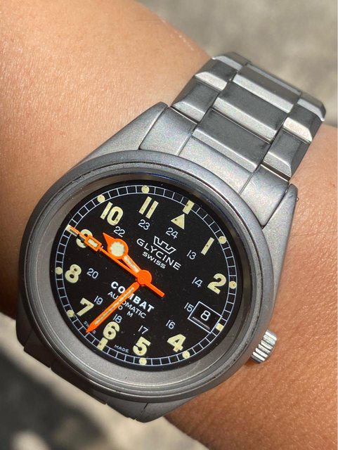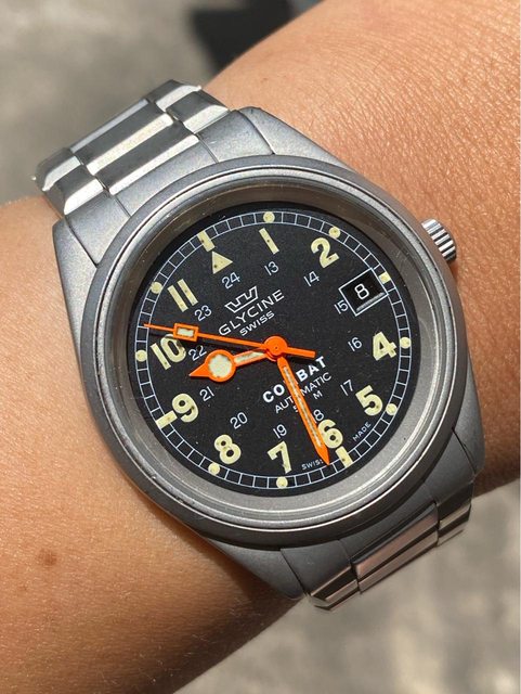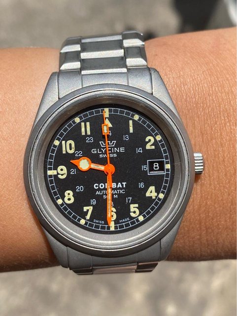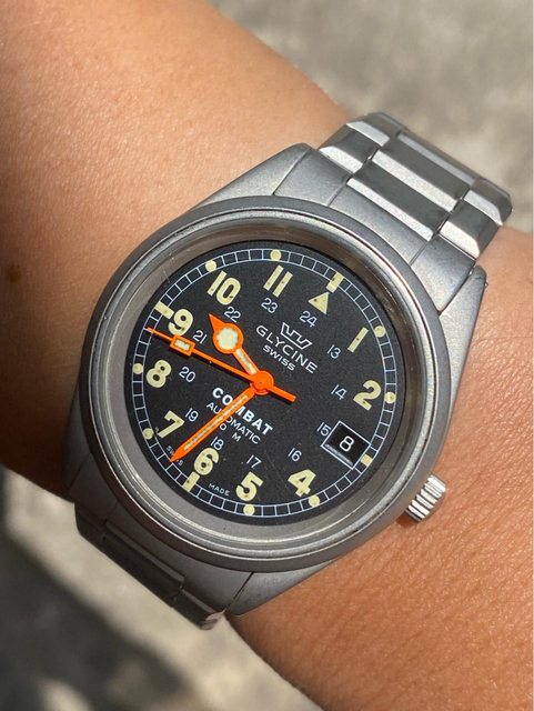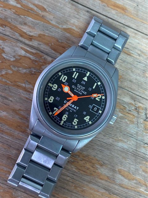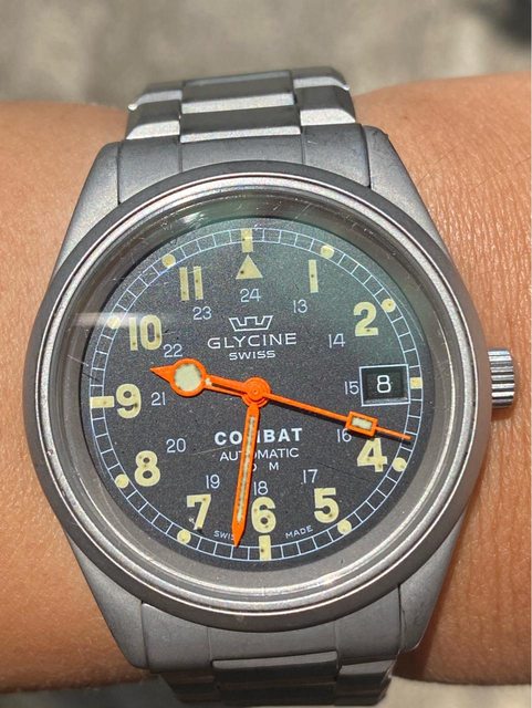 【商品名稱】Glycine Combat 軍錶 【商品價格】已售出4060元(含店到店 【新舊程度】美品 【走時等級】建議洗油 【附件】單錶一顆,原廠錶帶 ————————————————— 冠星-軍錶 絕版經典收藏美品 螢光霓虹指針十分特殊,吸睛亮眼 使用的瑞士通用機芯ETA 2824 錶徑37mm(不含龍頭) 匯款後店到店 不議價、無面交服務,無交流