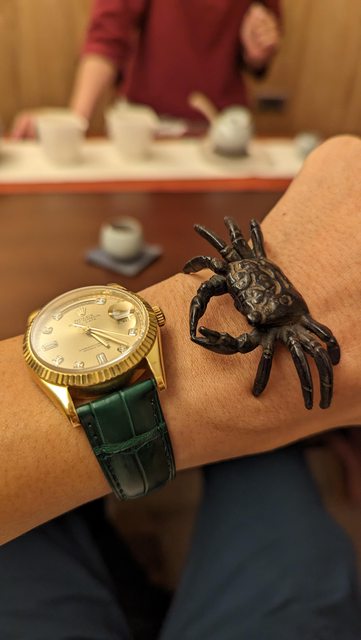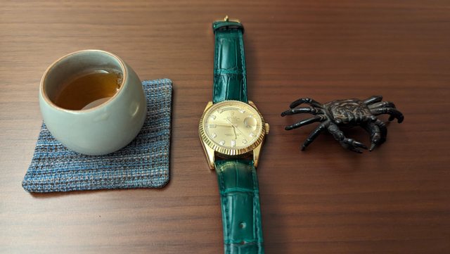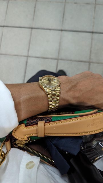但結果一陣子後朋友自己買到的二手黃面dd又轉手到我手上了,第一次戴起來視覺上感覺是猛,或是帥這種感覺,反而老的氣息有點淡掉了,此時腦袋有點衝擊,理性再想一下覺得會不會是銀色錶殼或銀色錶帶,搭配黃面才比較老(半金款),而顏色整體如果全部是黃色,就不是黃色了而是香檳金?回想幾年前有次跟一位前輩面交時,當是他就是帶全金dd現金,這位前輩身材壯碩整個就是健身房練家子,結果這樣搭配起全金dd也是猛帥屌,那次的畫面我也仍然記憶猶新,也是第一次對黃面有改觀的記憶。