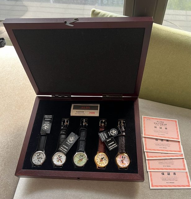 3.Seiko Alba 米老鼠2020紀念石英錶,一套共五隻,附上原廠木盒(木盒外觀些微老化