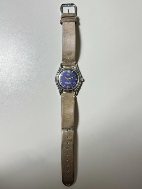 藍面復古文錶,有輕度痕跡,面盤6點鐘右方有小塊氧化痕跡(如圖)