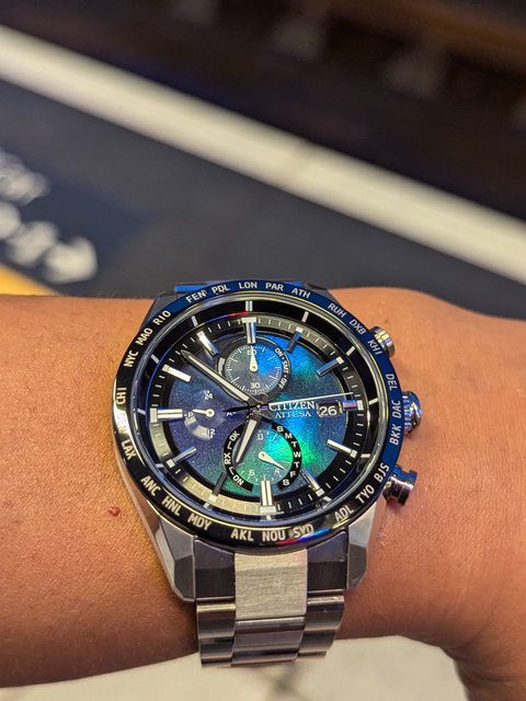 本來覺得光動能電波都是機械工業風,這款千彩之海就多了幾分神秘魔幻的感覺,有點像極光。整體鈦金屬戴起來真的很輕,一樣搭載防眩光藍寶石錶面