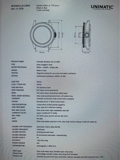 2. 商品名稱:限量Unimatic U1-DZN 軍綠潛水機械錶 義大利 購買日期:2023日本錶店 出售價格:$16800 -> $8800 隨附物件:盒+錶如圖 物品狀態:九成新,少用僅些許使用痕跡 手錶錶徑:40mm 手錶機芯:NH35A 物品地點:雙北 聯絡方式:站內信 規格可參考最後一張圖