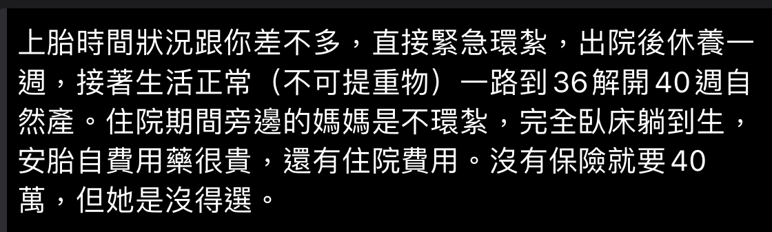 推 amberfline : 17週環紮,22週發現感染,23-32住院安胎,36拆,40 06/19 02:58