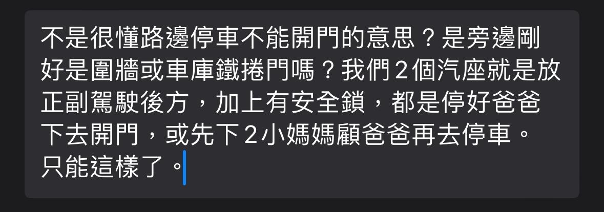 → chiachizhang: 但因為帶小孩出去玩的地方都有停車場,很少路邊停 04/24 10:06