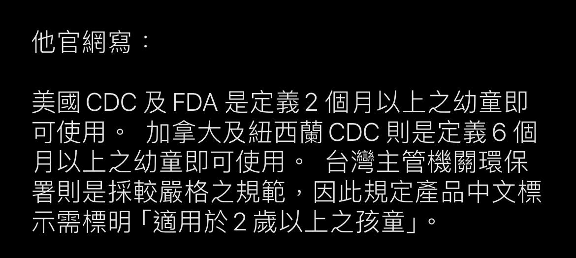 推 Hooooooh : 印象記得有含派卡瑞丁的,一律兩歲以上才可以用的 05/02 23:34