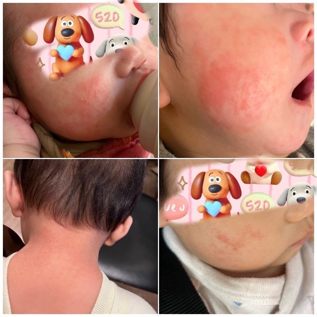 大寶皮膚不算好,但印象中也不像二寶這樣兩頰紅疹持續這麼長時間,摸起來是粗粗乾乾