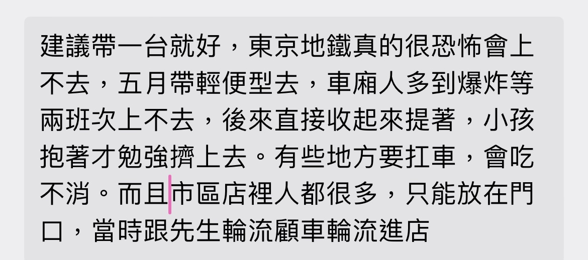 annie0726 : 如果市區是搭地鐵建議是帶一台推車就好,因為東京地08/12 23:05