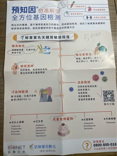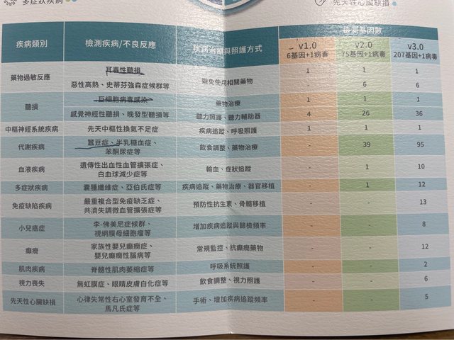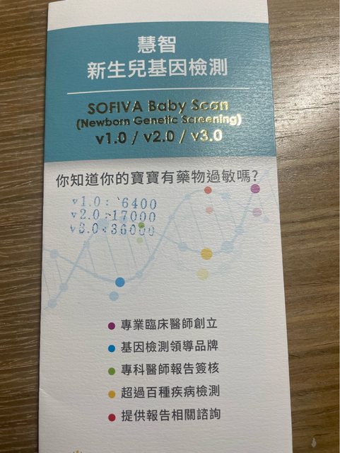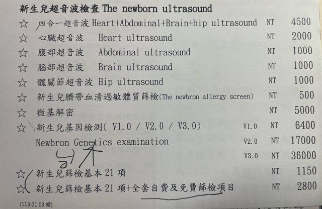 32週回診,原本以為只是簡單的打百日咳還有抽血檢查,沒想到醫院(高雄柏仁)突然丟 出了一堆寶寶的檢查要我們回去考慮要不要做.. 特別註明:這不是針對孕婦的,是針對寶寶的 1.新生兒超音波篩檢(有心臟、腹部、腦部及髖關節超音波檢測)4500元 2.新生兒臍帶血清過敏體質篩檢500元 3.新生兒基因檢測(有分最少6基因+1病毒檢測的到最多207基因+1病毒,詳圖)6400元-3 6000元 4.該院的自費檢查項目說明書(主要有各種超音波檢查、微基解密、新生兒基因檢測、新 生兒篩檢21項+全套自費及免費篩檢項目,各類價錢詳圖) 5.預知因微基解密全方位基因檢測(主要看膳食敏感、健康風險、污染物敏感、維生素需 求及流感風險)5000元 因為實在太多了,看了眼花撩亂,所以想直接問其他版友當初都做什麼檢查呢? 因為經濟的關係,我們目前傾向只做2(500元)跟4裡面的新生兒篩檢21項+全套自費及免 費篩檢項目(2800元) 如果有推薦一定要的檢查項目也麻煩各位版友告知.. https://i.imgur.com/WAGYbvL.jpeg