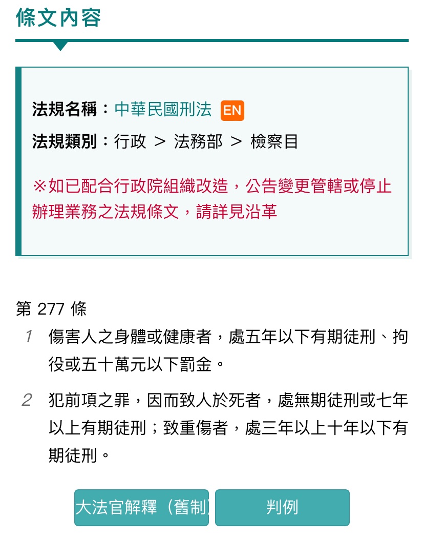 推 rainsilver : 是不是引用法條有問題啊 這不是什麼故意傷害吧 10/30 19:15