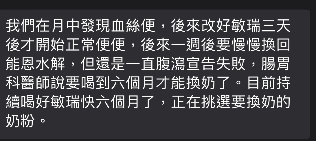 推 p96025 : 我女兒出生喝能恩水解,滿月開始出現血絲便,之前 11/17 17:58
