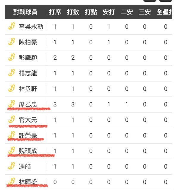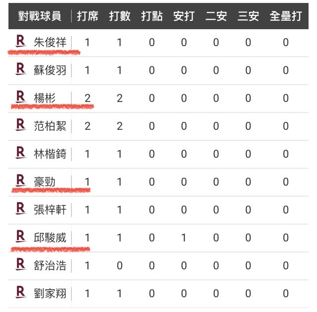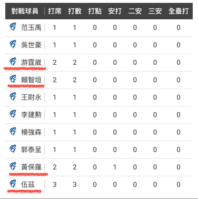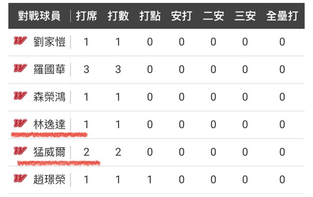分別對上這些投手,其中不乏一軍主力及洋將。
