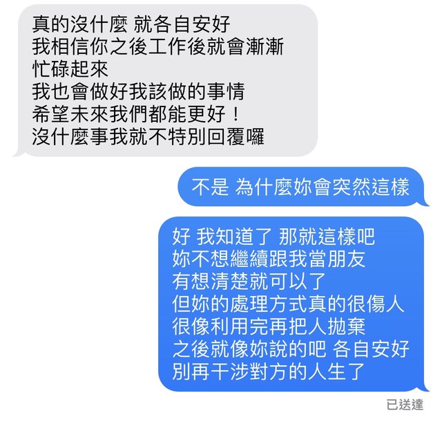 推 Fox9527 : 第一次斷聯是因為她有男友 第二次是女方說單身才決09/30 12:42