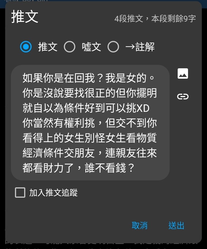 → levs : 你前面第一篇我推文意思是在跟你說 女生問現實條件10/19 18:30