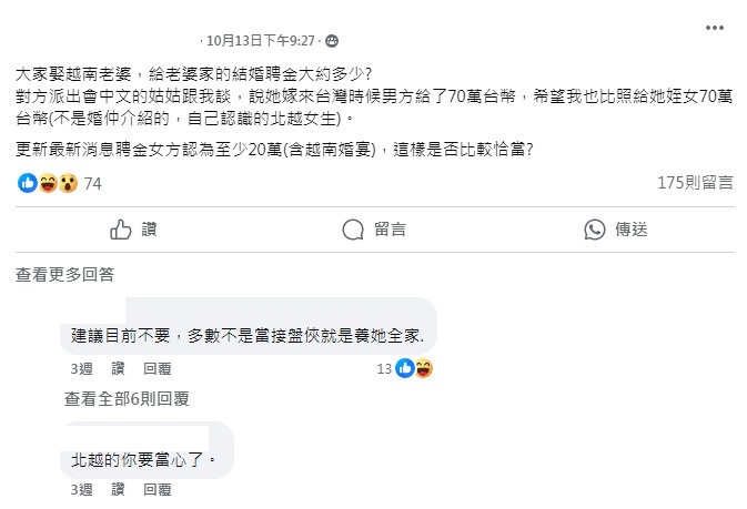 姑姑表示,她自己嫁到台灣時,男方給了70萬台幣作為聘金,所以希望這位網友也能比照,給她的姪女70萬台幣。