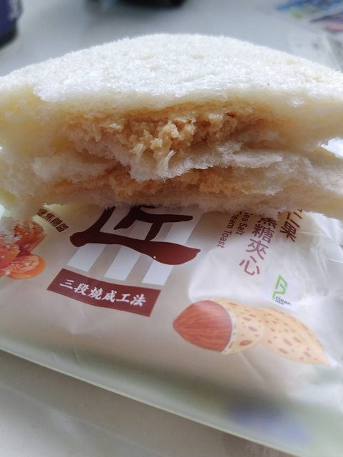 內餡的料看起來蠻多的,好像都是杏仁果粒,第一口吃下去覺得有點花生味…