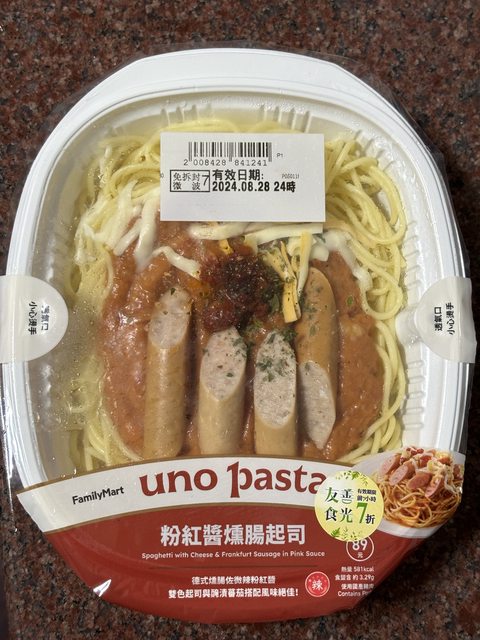 到了全家,看到一個友善時光的「粉紅醬燻腸起司義大利麵」,突然有點心動。