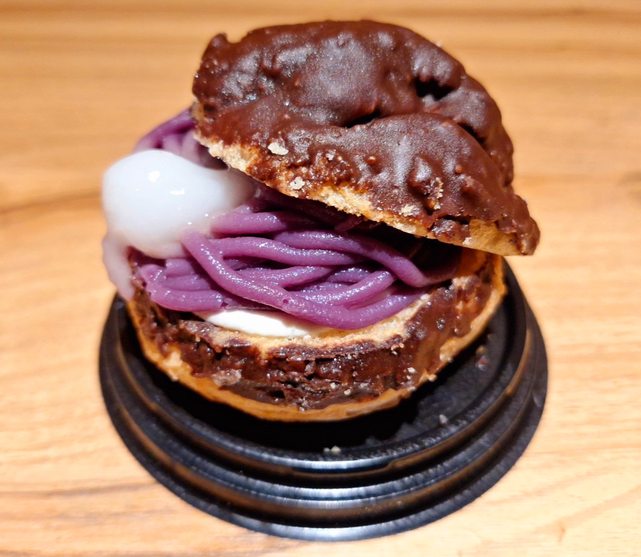 外面是巧克力脆皮泡芙 中間夾著紫地瓜的蒙布朗蛋糕 還有一顆湊熱鬧的糰子