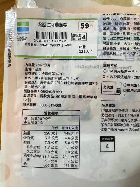 【規格/內容物/熱量】:長堡:283kcal,食鹽含量約1.2g/蘿蔔糕:228kcal,食鹽含量約1.72g