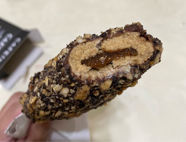 雪糕本體是拿鐵咖啡冰淇淋,甜度不會很高,單吃其實就很不錯,但最驚豔的是內層的咖