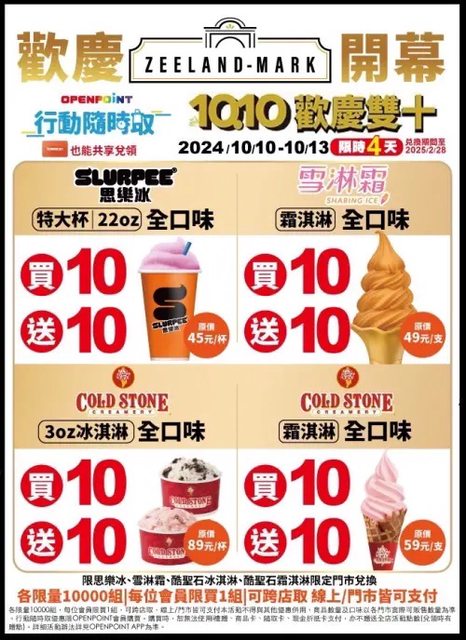 雙十節國慶日超商消暑優惠猛加碼!全家今(10)日除了有隨買跨店取霜淇淋買10送10外,明(11)日起一連三天霜淇淋買一送一;7-11即起至10月13日限時三天,行動隨時取霜淇淋、思樂冰、cold stone冰淇淋通通買10送10。