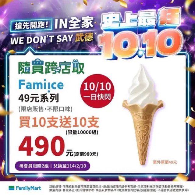 ▲全家霜淇淋買10送10只限國慶日。(圖/全家提供)