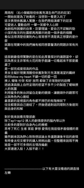 推 Mayee: 兩位演得很好,可是太刻意一直強調生死議題,後面就放棄了 05/11 15:57